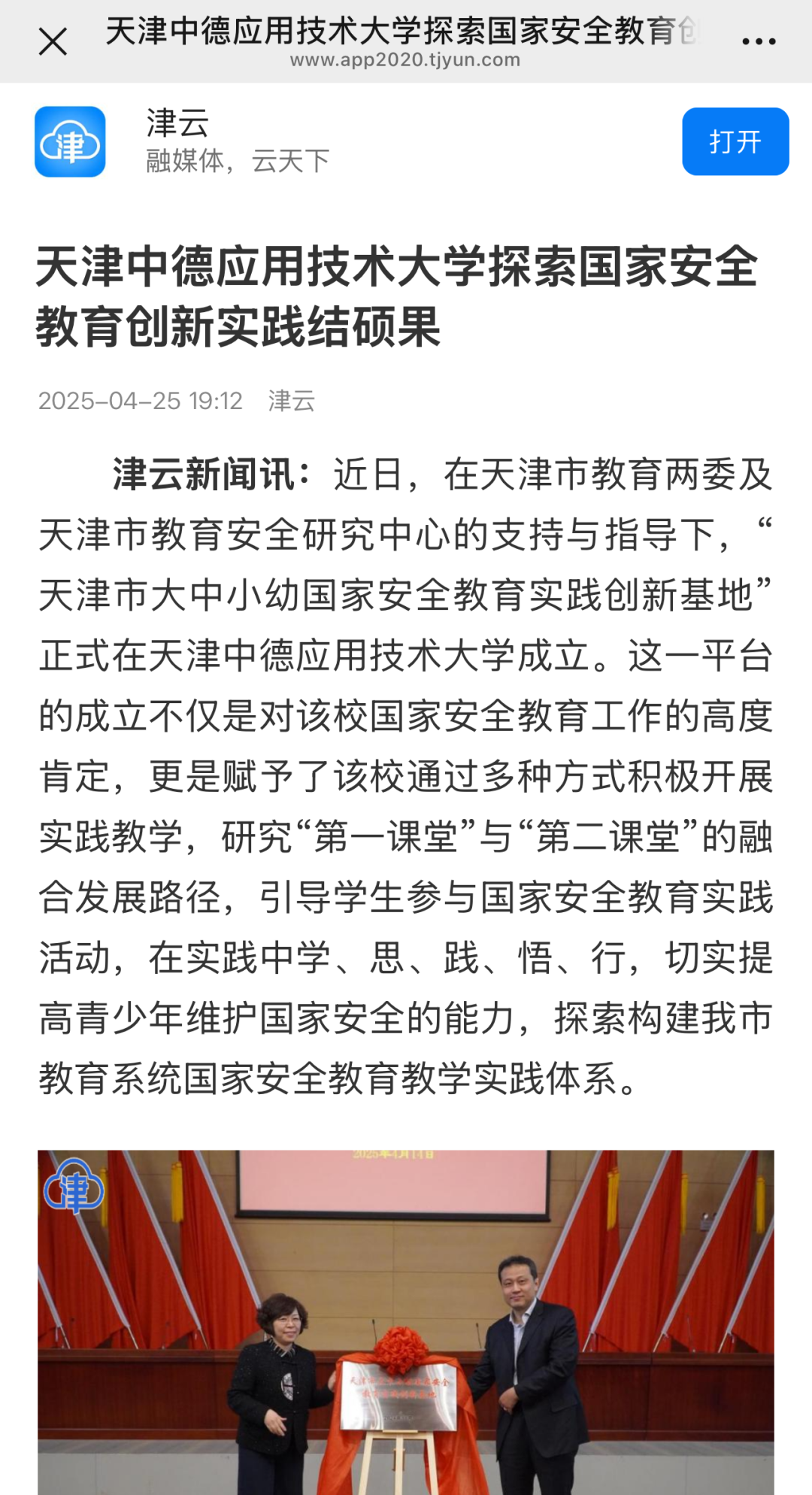 近日,津云报道“天津市大中小幼国家安全教育实践创新基地”正式在我校成立。