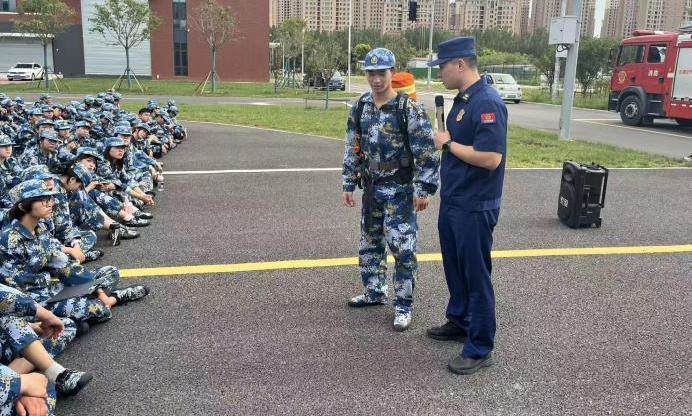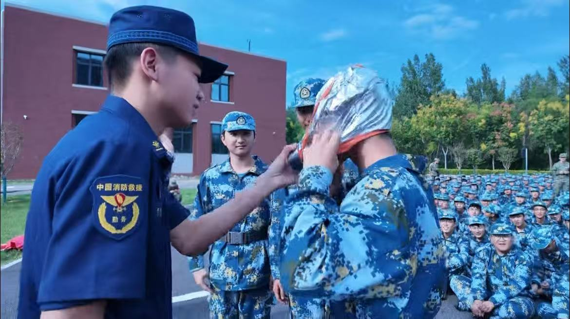 此次活动邀请津南区海河教育园雅观路消防救援站的消防战士们,为2025级新生逐一展示干粉灭火器、防烟面罩、正压式空气呼吸器等专业消防装备的功能与使用场景,并现场演示消防车水炮快速出水灭火的精湛技能。他们规范利落的操作流程、反应敏捷的处置能力,赢得在场师生的阵阵掌声与由衷赞叹,让新生们对消防救援工作有了更直观、深刻地认识。